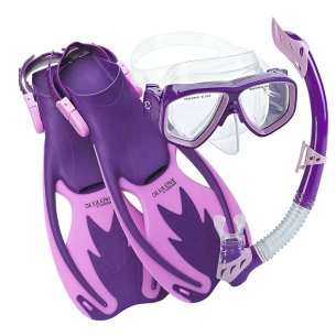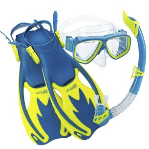 The Cressi Junior Kids Rocks Snorkel Set comes in three colors and two sizes. These are designed for children aged from around 6 to around 14. The snorkel set includes a set of fins, a traditional style face mask with a silicone skirt edge that's designed to accommodate children's narrower faces.